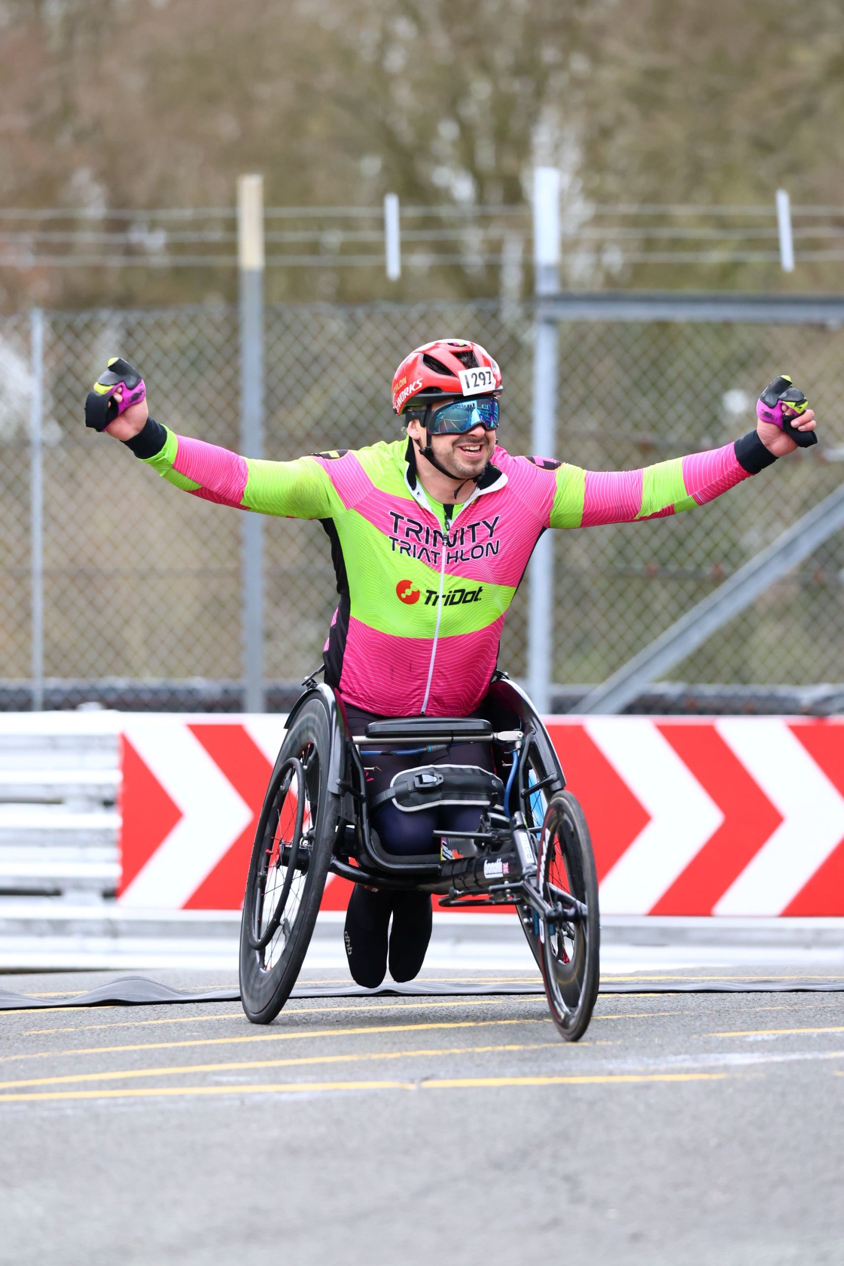 I still have nightmares of my first ever duathlon, my first race as a para athlete here at Oulton Park. As you start, you drop down a dip and the climb back up the other side is reasonably steep. When it’s damp, it can be hard to maintain grip on the racing chair’s push rims and then you stop. This happened to me on my first race. I literally went backwards in the first two minutes of my first ever race! I’m a little bit quicker now, and a little braver on the down part of the dip, giving me most of the momentum to get over the brow of the hill. Luckily it was a dry day at this point, so I had plenty of grip. Accelerate all the way down to the turn. Make the turn in one go. Another trauma ticked off. Back round to the start line ready for another lap. Adrian the organiser is there supporting and I hear him say “Use all the track, you’ve paid for it” which makes me smile. It’s something I picked up from racing cars on track, and I used to coach cyclists about crit racing, and the advice is still true here.